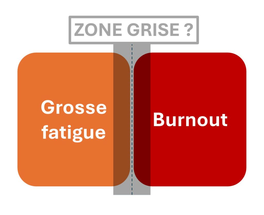 En conclusion, une différence fondamentale entre la grosse fatigue et la zone grise est que, pour sortir de la grosse fatigue, il faut se reposer, tandis que pour sortir de la zone grise, il faudra fournir des efforts qui seront d’autant plus difficiles à fournir qu’il y a peu d’énergie disponible.